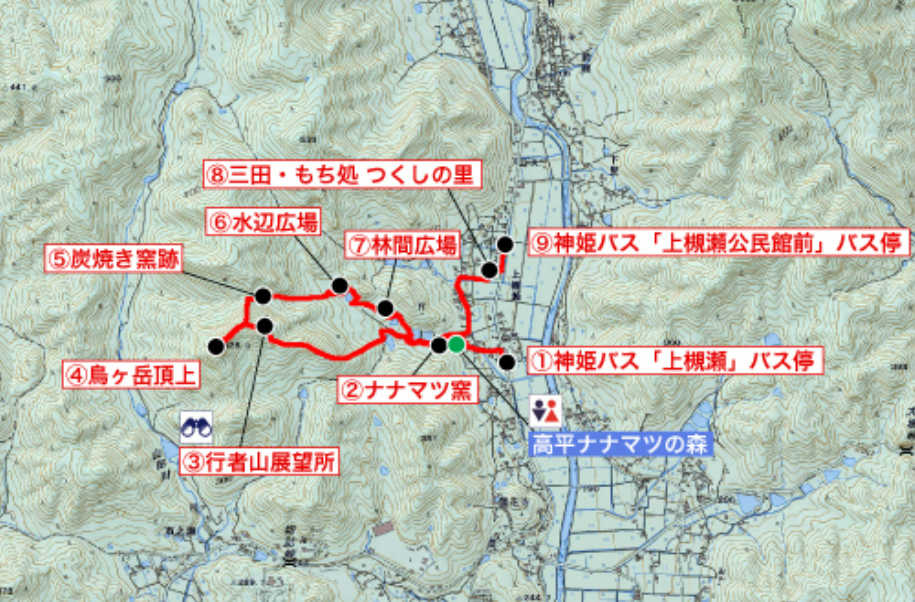 高平ナナマツの森を周遊するファミリー向けの初心者コースです。眺望が望めるのは行者山展望所の一か所だけですが、遊歩道は整備がされて歩きやすく、散歩コースとしても最適です。静かな森の中には整備されたベンチがある広場や神秘的な池があり、訪れる人々の心を癒します。帰路は、つくしの里の高平名物「つくしうどん・そば」がお勧めです。 ▶コース概要とスポット一覧