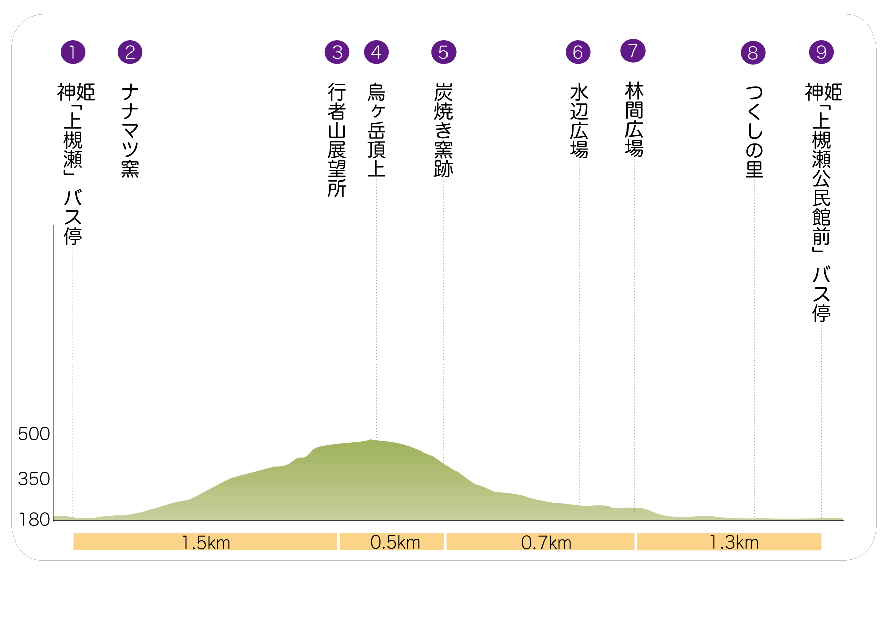 高平ナナマツの森を周遊するファミリー向けの初心者コースです。眺望が望めるのは行者山展望所の一か所だけですが、遊歩道は整備がされて歩きやすく、散歩コースとしても最適です。静かな森の中には整備されたベンチがある広場や神秘的な池があり、訪れる人々の心を癒します。帰路は、つくしの里の高平名物「つくしうどん・そば」がお勧めです。  ▶コース概要とスポット一覧